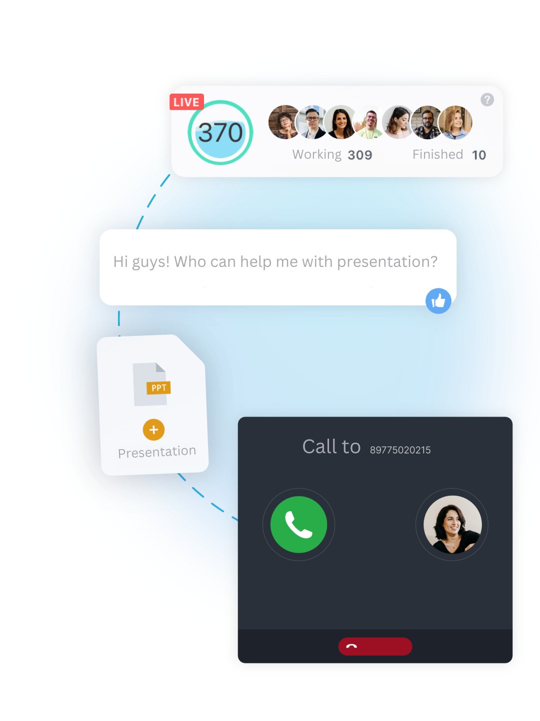 Colleagues, customers and contractors are connected with high quality video and audio, stable connection and support for group calls of up to 48 people. It's easy to start a call right from a task, a calendar event, or a post in Company News.